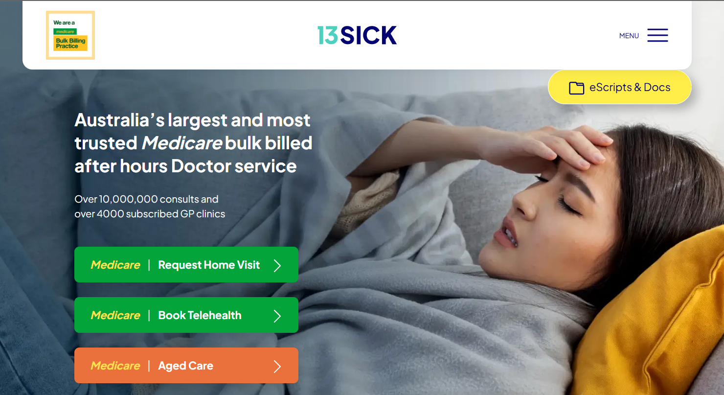 13Sick is a free, Medicare-funded after-hours GP service offering telehealth and, in some cases, home visits. It operates Australia-wide for eligible patients and is available when most regular GP clinics are closed (weekdays 6 pm–8 am, and throughout the day on weekends). There is never an out-of-pocket cost. In very simple terms, a patient goes to the 13Sick website, requests a telehealth appointment, and provides some basic information about why they need to be seen. The patient is then placed in a queue, given an estimated wait time, and once a doctor picks up the consult, the doctor calls the patient directly.